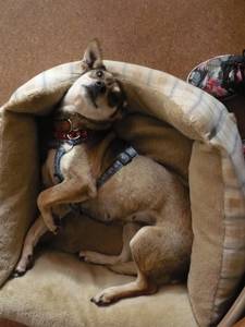 Ist aber Ruhe angesagt oder gerade niemand zum Spielen da, dann kuschelt sie sich ruhig auf ihren Platz und schlummert friedlich träumend vor sich hin.