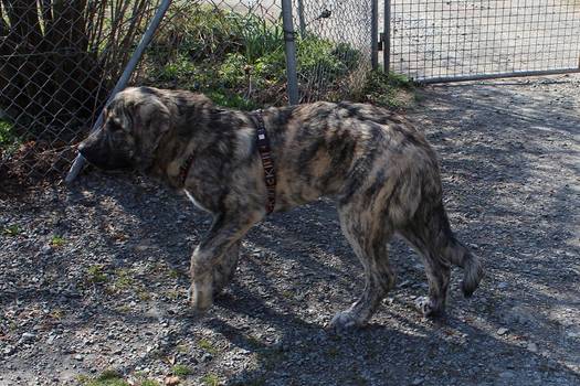 PONO ist ein bildschöner junger Mastín Leonés – bei uns bekannter ist die Bezeichnung Mastín Español. Ob er ganz reinrassig ist oder ein wenig gemischt, wissen wir nicht. Er sieht schon sehr rassetypisch aus! Er wurde in Spanien geboren und kam im Februar mit seiner Mutter und zwei Brüdern nach Deutschland in ein Tierheim, seit Anfang April wohnt er nun auf seiner jetzigen Pflegestelle in einer gemischten Hundegruppe. Schon jetzt ist er, das Nesthäkchen, mit fast 40 kg und über 60 cm Schulterhöhe der „Riese“ in der Gruppe!