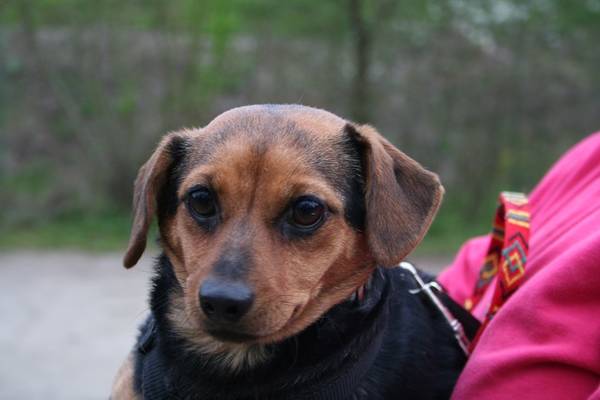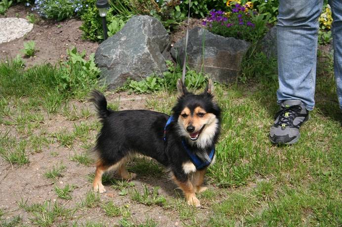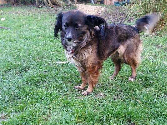 Vorsicht Kampfschmuser  . Das trifft völlig auf die kleine Page zu. Page ist eine Mischlingshündin, geboren am 15.12.2011, 29 cm klein und wiegt 4,3 kg. Sie hat braun/schwarzes mittellanges weiches Fell mit schönem Behang an Beinen und Rute. Page ist ein Papillon-Mix, was ihre typischen Papillon-Öhrchen verraten. Ein weißer Brustfleck rundet ihre Schönheit ab. Ihre kleinen dunklen Äuglein sind stets auf ihr Pflegefrauchen gerichtet und in ihrem kleinen Kopf überlegt sie wie sie am besten und schnellsten wieder auf den Schoß des Menschen gelangt. Page liebt es zu schmusen, und das ausgiebig und lange. Sie verträgt sich gut mit anderen Hunden und auch mit Katzen und im Auto fährt sie ganz brav mit. Im Haus verhält sie sich ruhig und brav. Sie bleibt auch brav mit den anderen Hunden der Pflegefamilie zu Hause. Wer also auf der Suche nach einer treuen und anhänglichen Begleiterin ist, der ist hier bei Page genau richtig. Sie ist unkompliziert und einfach nur lieb. Page ist glücklich, wenn sie dabei sein darf. Man kann sie überall mit hin nehmen. Page wartet schon auf Ihre neue eigene Familie und freut sich auf den Kennenlerntermin.