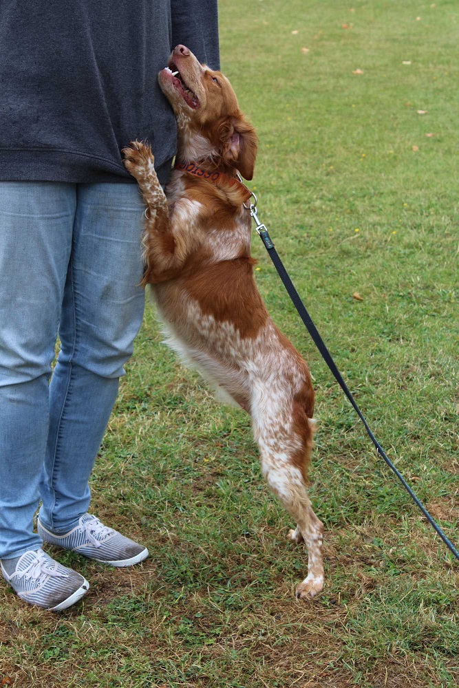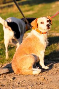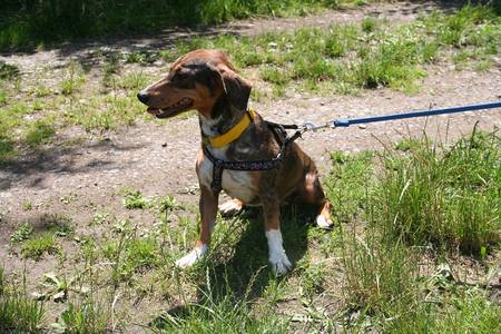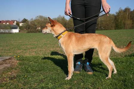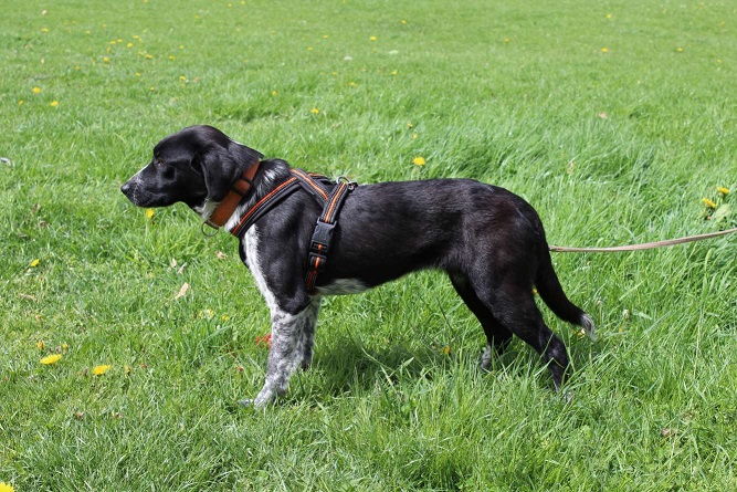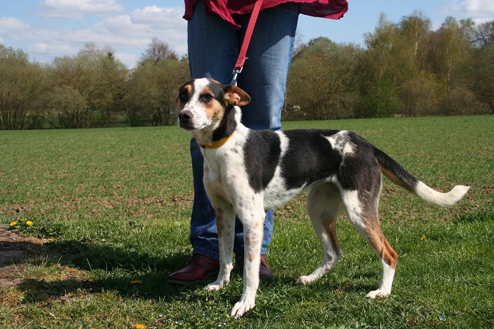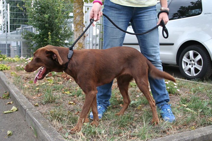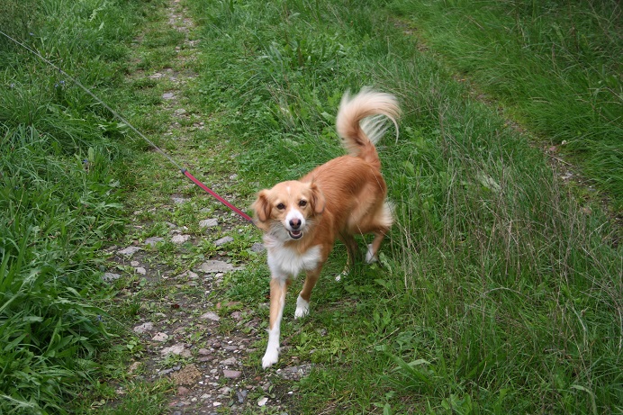 Sie geht vorbildlich an der Leine, gerne mit flottem Schritt und wedelt stets fröhlich dabei.